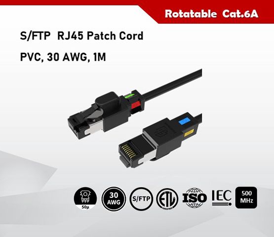 كابل باتش PVC 1M Cat.6A STP معتمد من UL، مشبك دوار فائق النحافة
