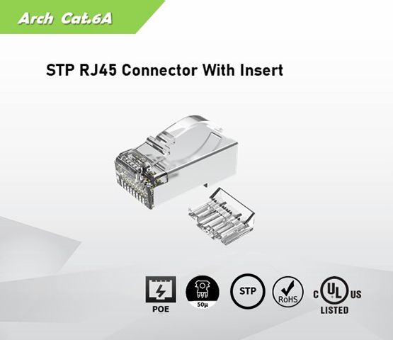 Cat.6A Arc RJ45 STP Connector is two-piece design, staggered wire holes with 4 up 4 down insert to enhance 8P8C plug performance. Using load bars to eliminate cross-talk and prevent electromagnetic interference. The channel rated Cat.6A UTP Connector is durable and bend resistance. With RJ45 gold-plated 50 U" contacts for 750 mating cycles provide superior conductivity.