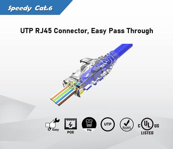 - Hızlı serisi RJ45 konnektörü, Easy Pass Through tasarımı ile kolay montaj sağlar ve normal konnektörlerden daha iyi performans gösterir.